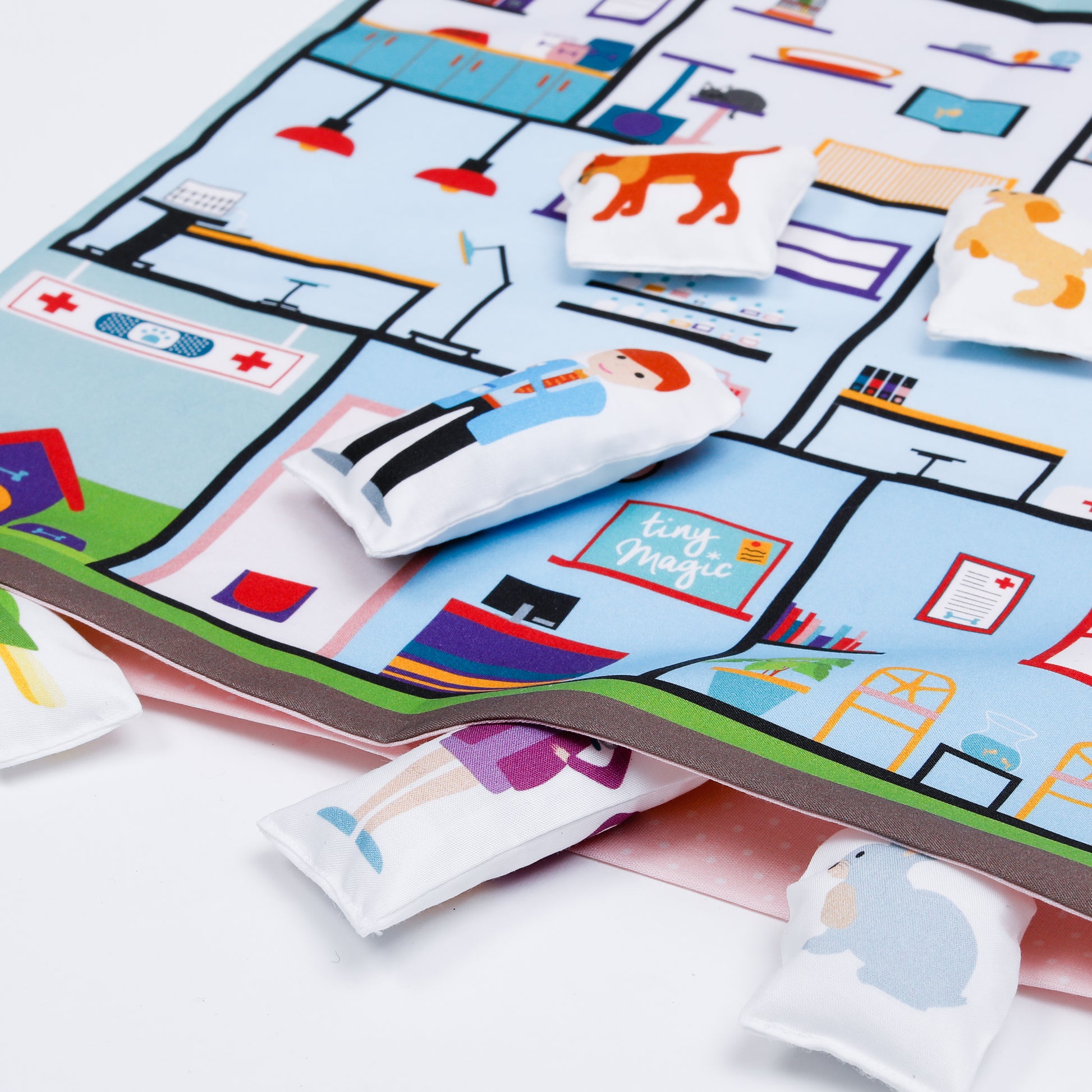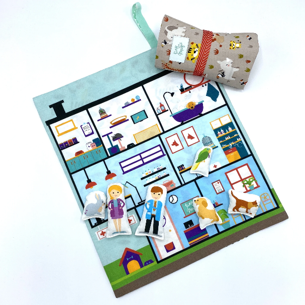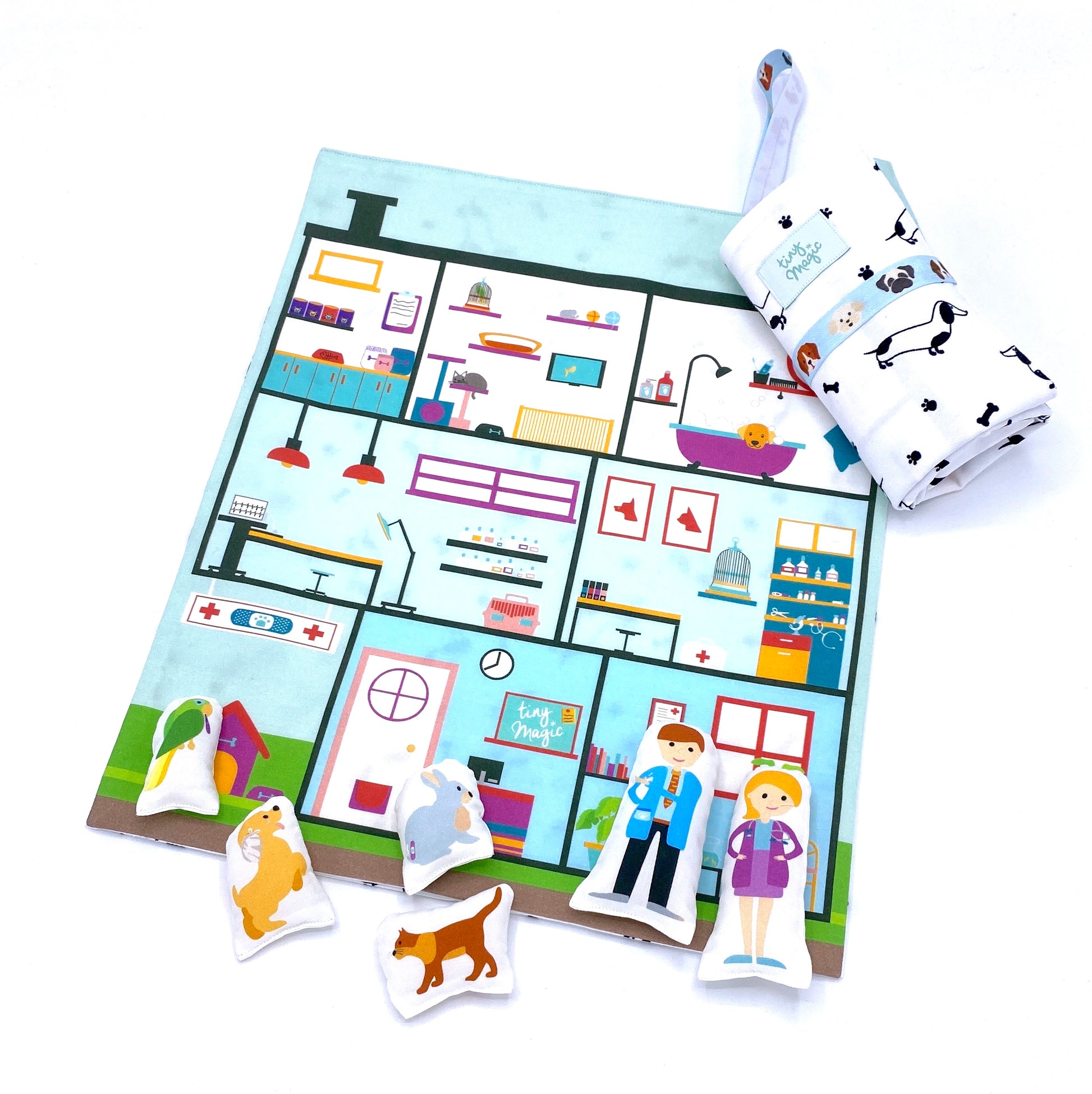 Χειροποίητο playmat με το πιο πολύχρωμο νοσοκομείο μικρών ζώων με την εξωτερική πλευρά του ντυμένη με ευφάνταστο ύφασμα σε 2 διαφορετικά σχέδια!