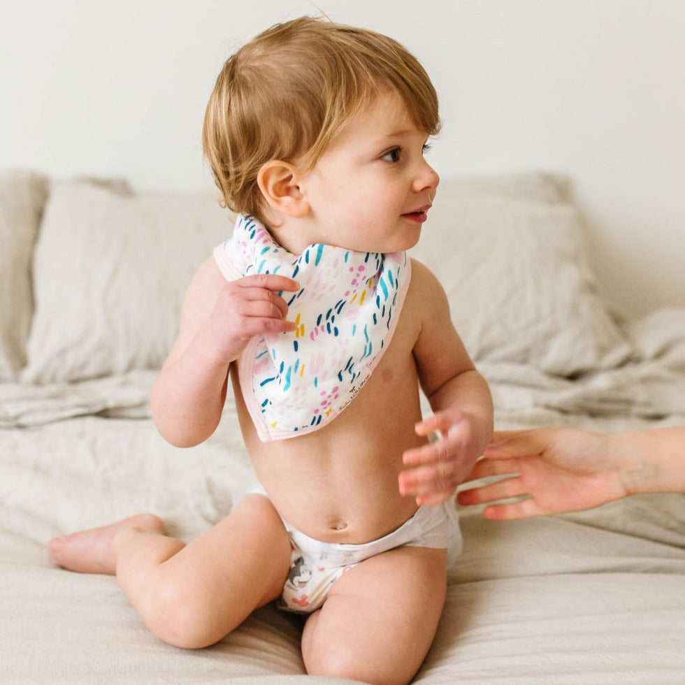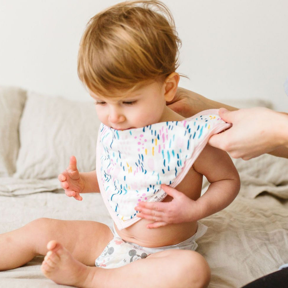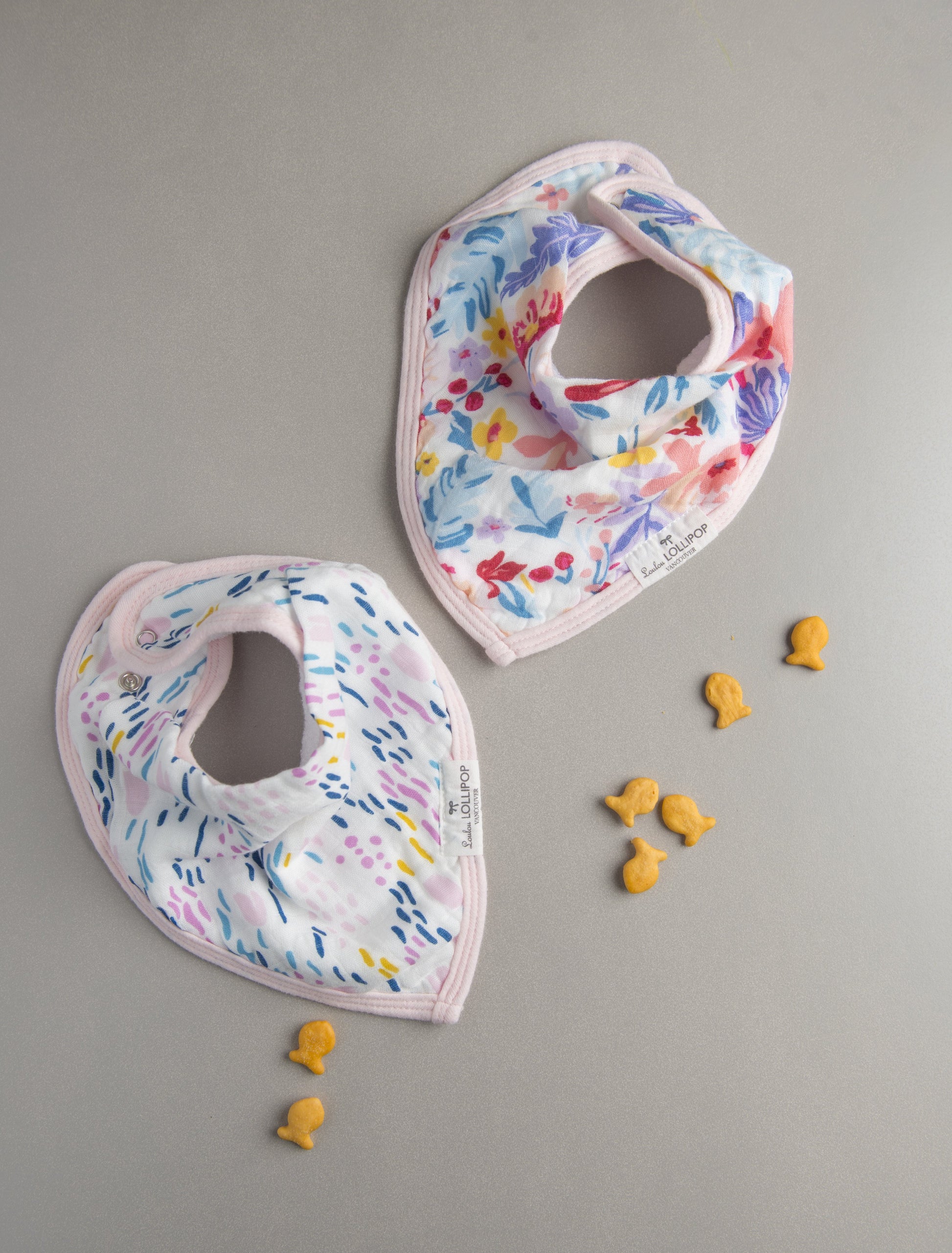 Σετ με 2 σαλιάρες σε διαφορετικό σχέδιο, με ειδική απορροφητική επένδυση για να μην "ξεφεύγει" τίποτα στα ρουχαλάκια του: σαλάκια, γάλα, γουλίτσες ή φαγητό!