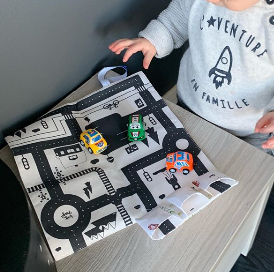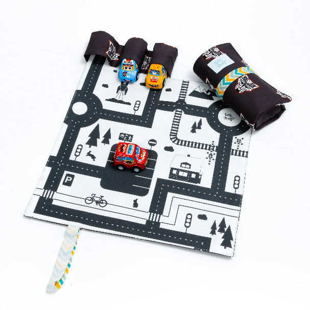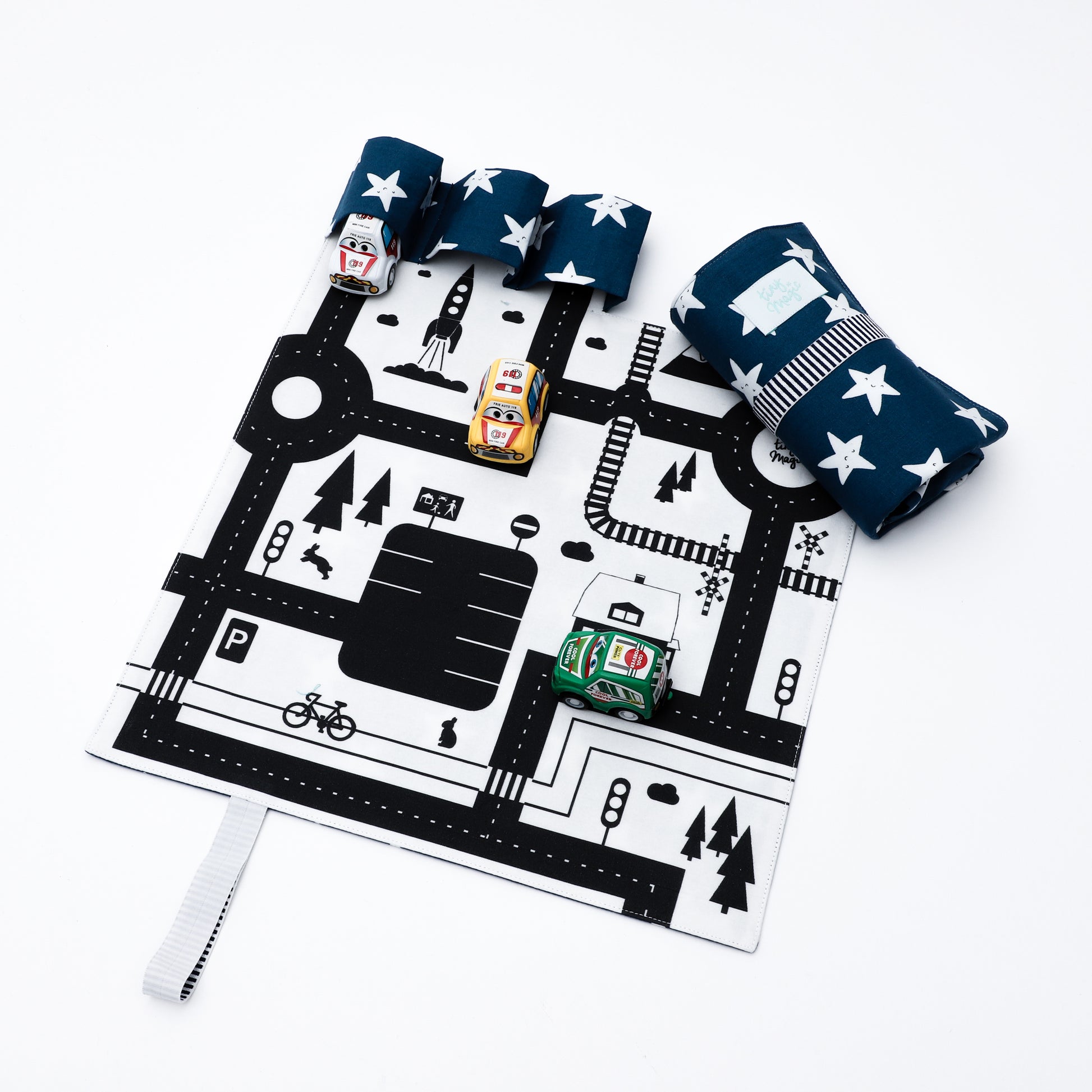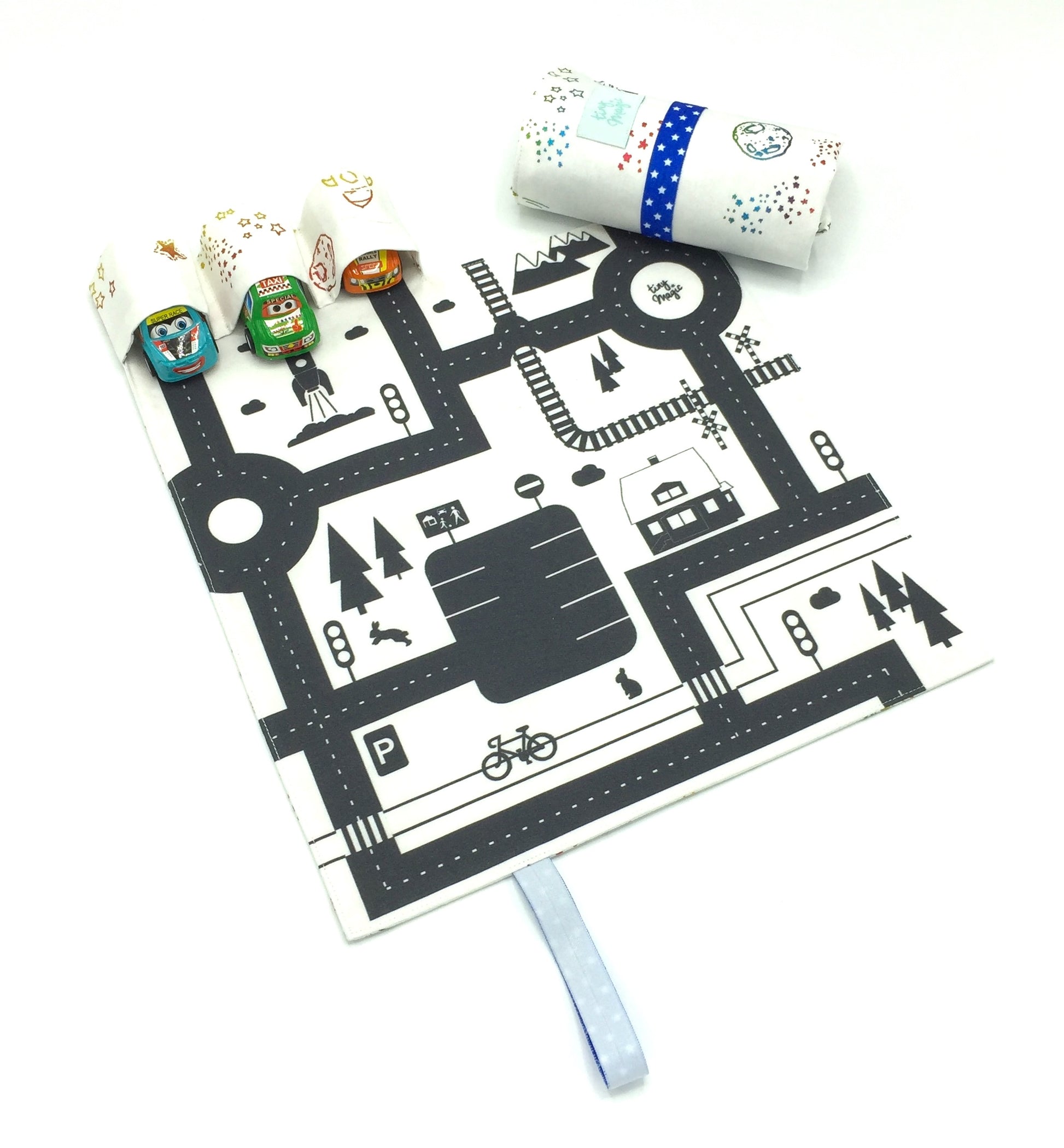 Χειροποίητο playmat με ασπρόμαυρη πόλη! Το εσωτερικό ύφασμα έχει όλα όσα χρειάζεται μια μικρή πόλη: δρόμους, διασταυρώσεις, σπιτάκια, δέντρα και φυσικά 3 πλαστικά μικρά αυτοκινητάκια (που χαμογελούν...) για να κυκλοφορήσουν! Η εξωτερική πλευρά του playmat είναι ντυμένη με ευφάνταστο ύφασμα σε 2 σχέδια!