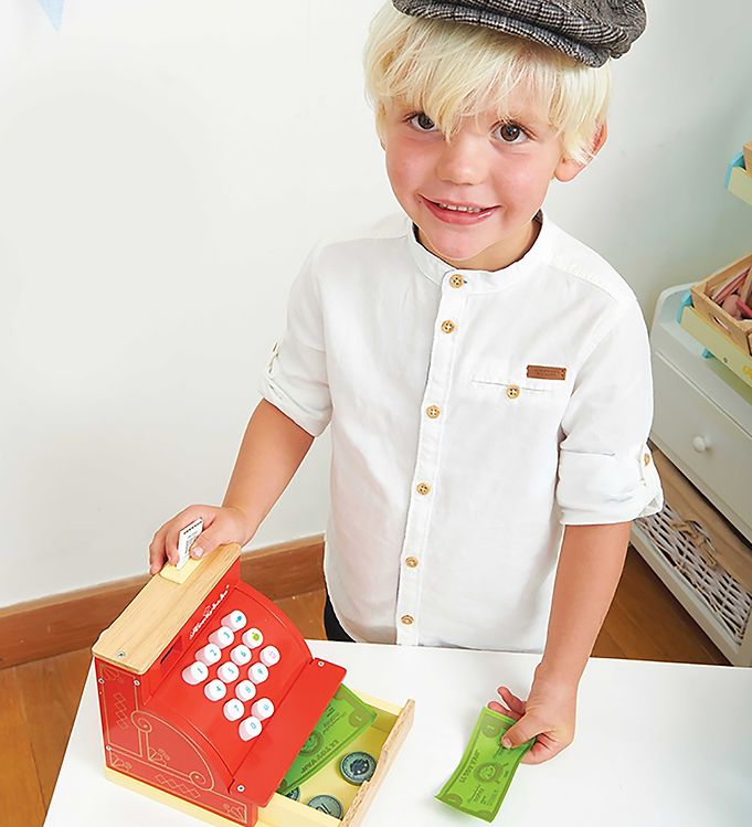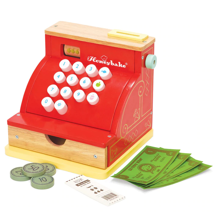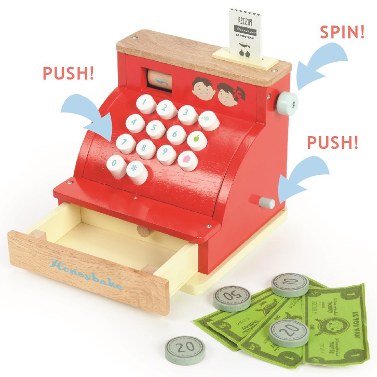 Και για να γίνει το παιχνίδι ακόμα πιο ενδιαφέρον.. περιέχει χαρτονομίσματα και κέρματα. Έχει συρτάρι για την αποθήκευση των κερμάτων που ανοίγει αυτόματα πατώντας το κουμπάκι! Επίσης, περιέχει μια απόδειξη, κέρματα και χαρτονομίσματα.