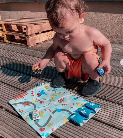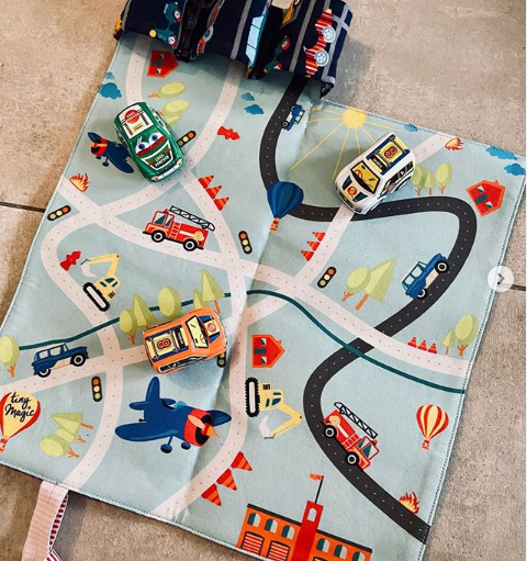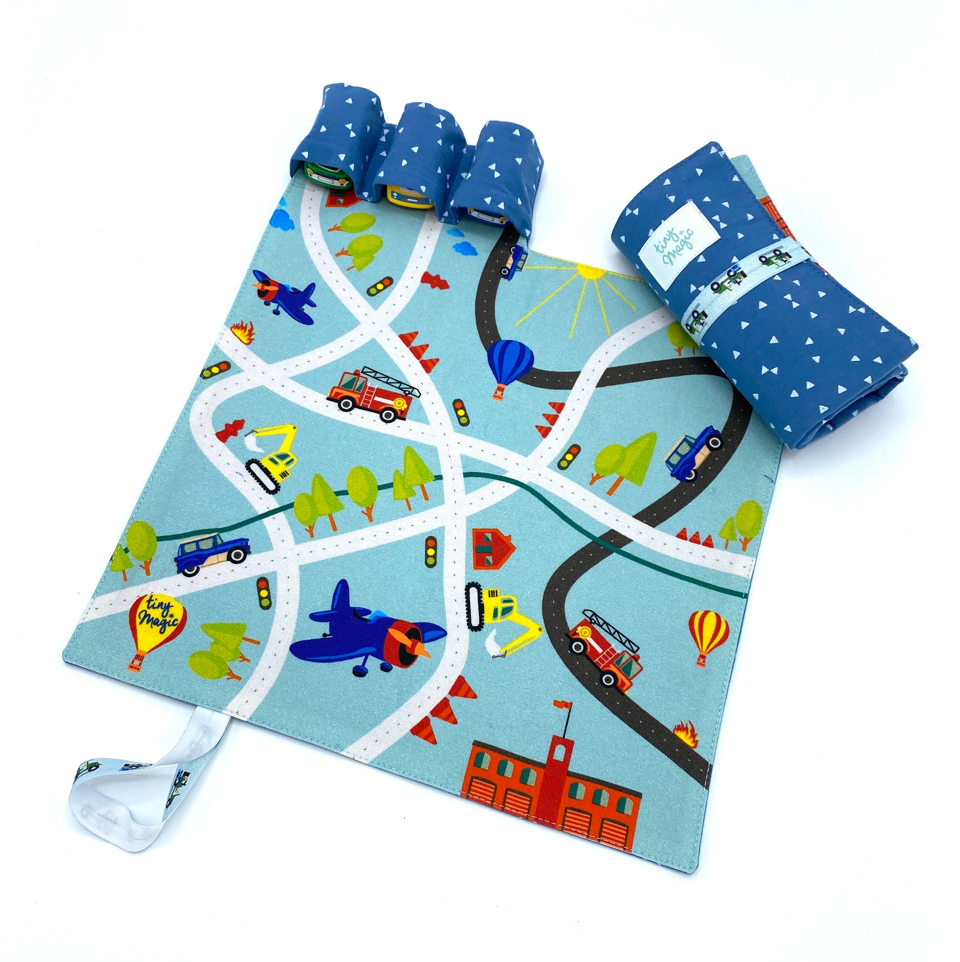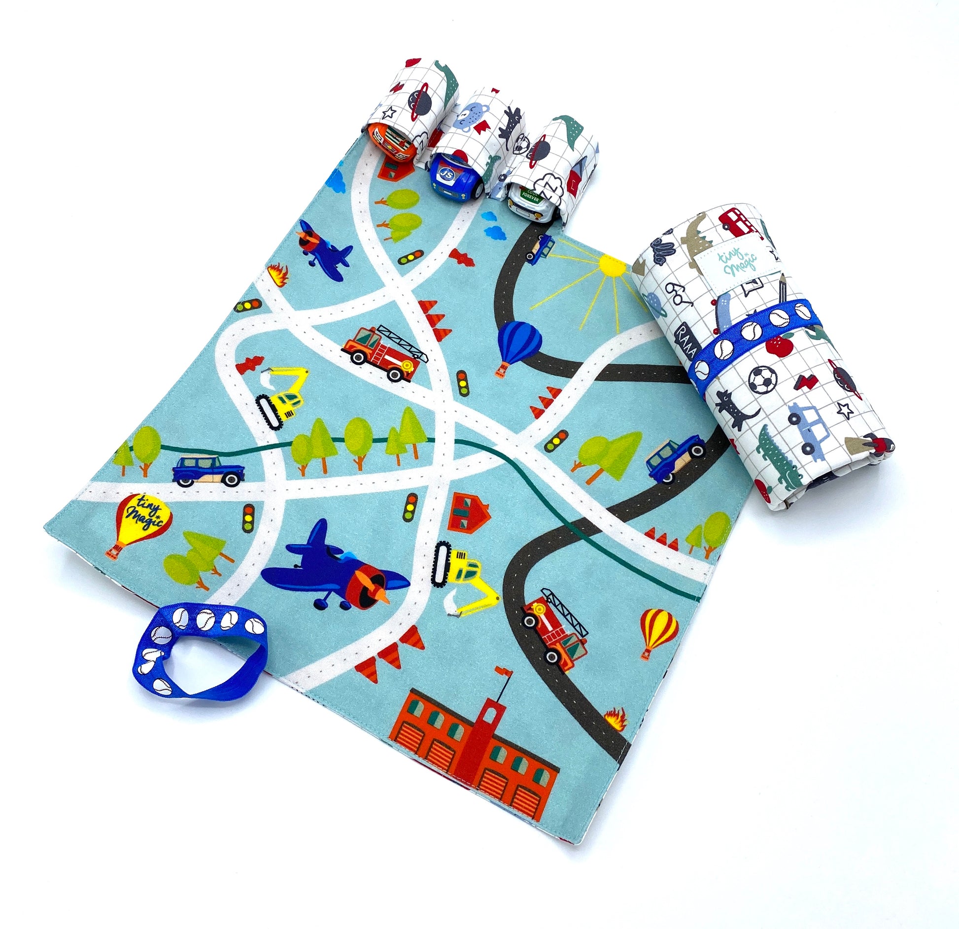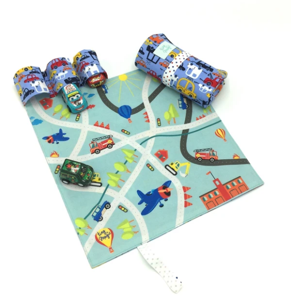 Χειροποίητο playmat με πολύχρωμη πόλη! Το εσωτερικό ύφασμα έχει δρόμους, δέντρα, διασταυρώσεις, πυροσβεστικό σταθμό, αεροπλανάκια, αερόστατα και φυσικά 3 πλαστικά μικρά αυτοκινητάκια (που χαμογελούν...) για να κυκλοφορήσουν! Η εξωτερική πλευρά του playmat είναι ντυμένη με ευφάνταστο ύφασμα σε 2 διαφορετικά σχέδια!