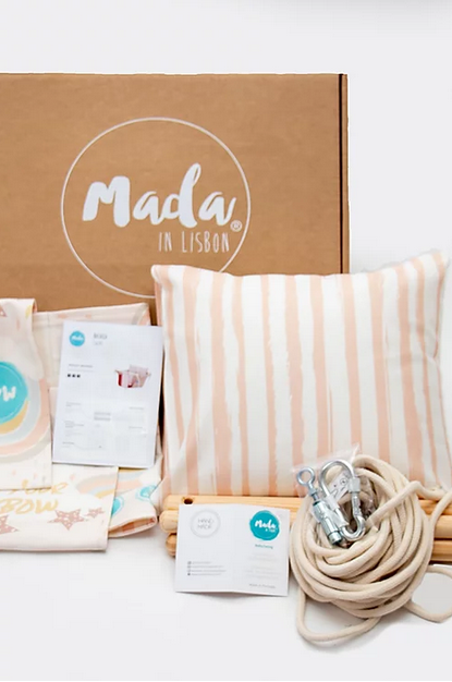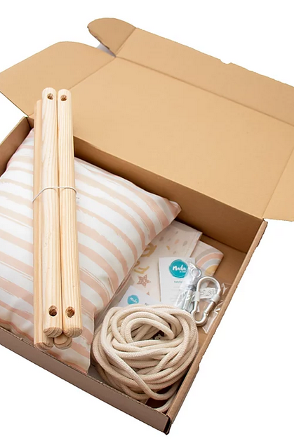 Είναι φτιαγμένη με ύφασμα 100% βαμβακερό και είναι ιδανική για μωράκια από 6 μηνών. Αντέχει μέχρι και 50kg βάρος και το ύφασμα πλένεται στο πλυντήριο στους 40ºC! Περιλαμβάνει μαξιλαράκι 30cm x 30cm από αντι-αλλεργικό ύφασμα, 2 σχοινιά μήκους 5m και ειδικά εξαρτήματα για να την κρεμάσετε στο ταβάνι. Περιλαμβάνει οδηγίες και απαιτεί συναρμολόγηση.