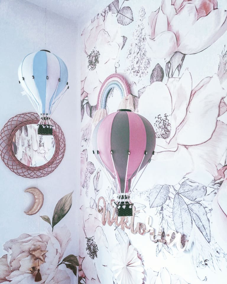 Διακοσμητικό κρεμαστό αερόστατο για το παιδικό δωμάτιο! Κρεμάστε το ψηλά και αφήστε την φαντασία των παιδιών να φτάσει στα σύννεφα! Τα χρώματά του είναι γκρι και ροζ!