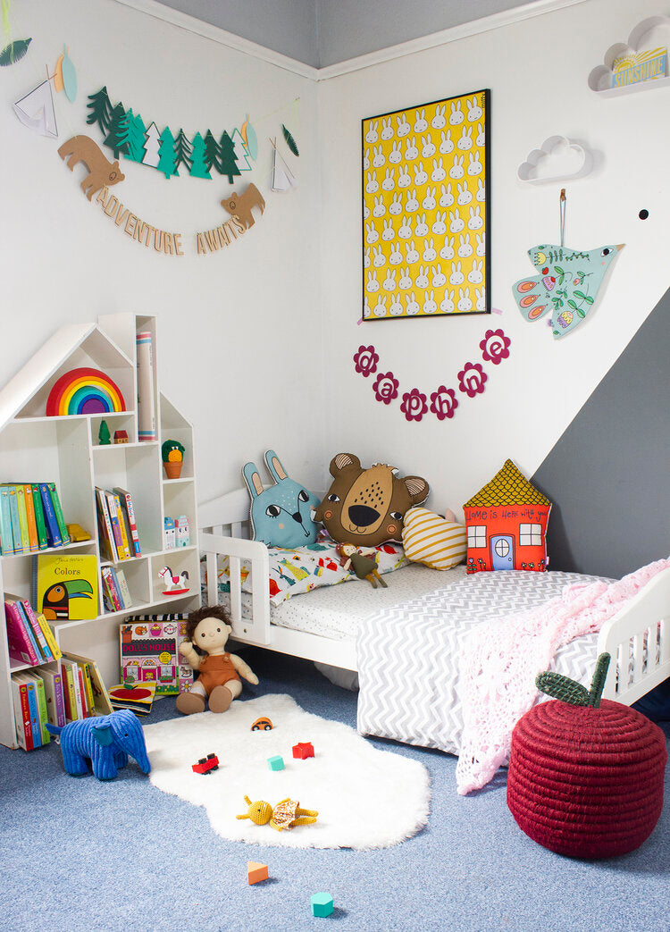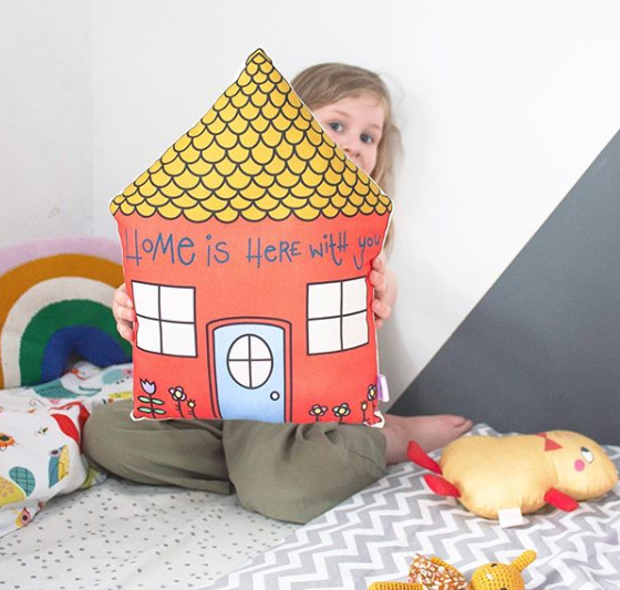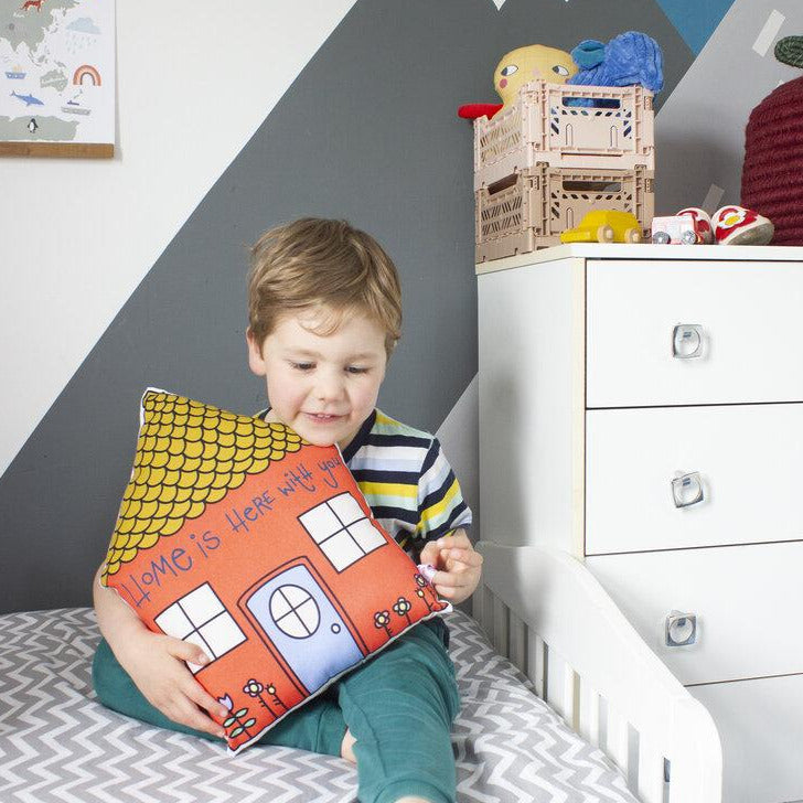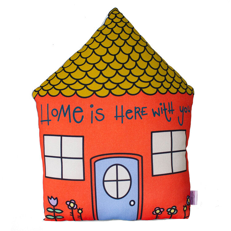 Μαλακό μαξιλαράκι σπιτάκι, με την επιγραφή "Home is Here with You". Ο πιο τέλειος τρόπος να διακοσμήσετε το παιδικό δωμάτιο! Στην πίσω πλευρά έχει πουά ύφασμα εκρού και λευκό.