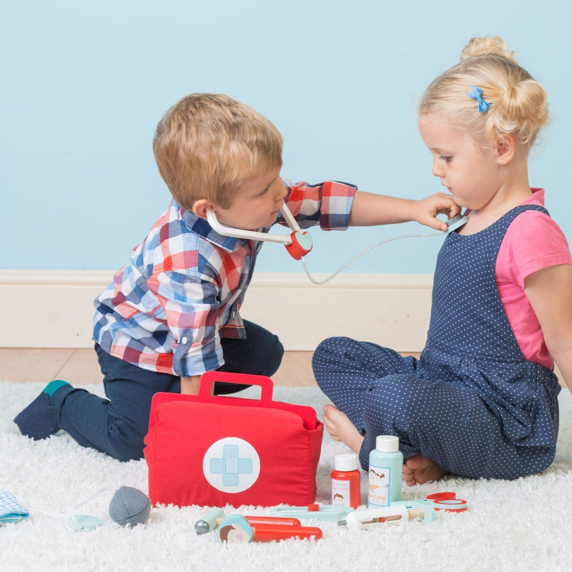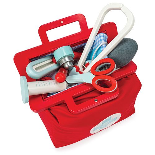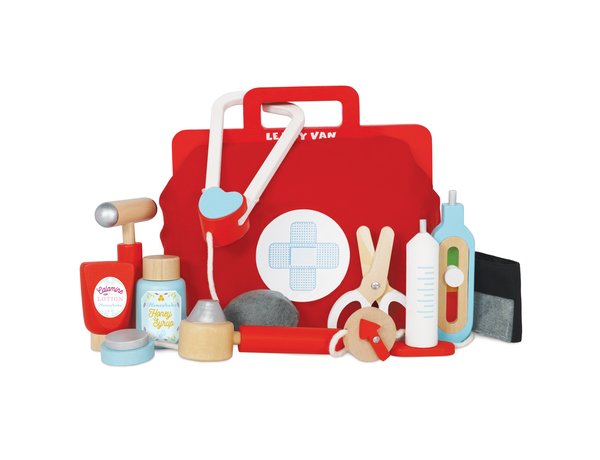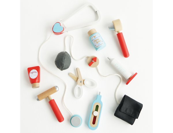 Μικρού μεγέθους ιατρική τσάντα γεμάτη με ξύλινα ιατρικά όργανα και μπουκαλάκια. Το σετ περιλαμβάνει στηθοσκόπιο, θερμόμετρο, σύριγγα, μετρητή πίεσης, ωτοσκόπιο, αντανακλαστικό σφυρί, ψαλίδι και δύο φιάλες φαρμάκων.