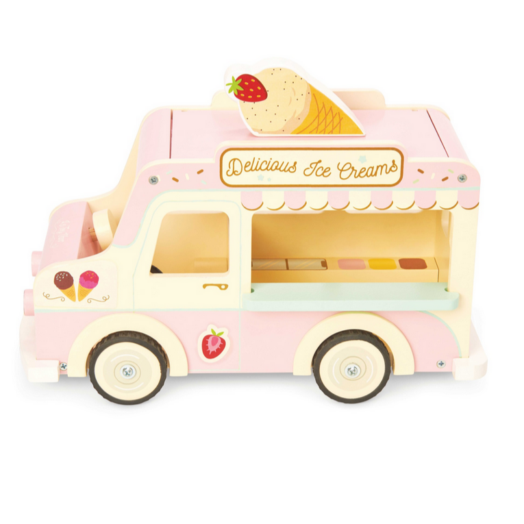 Ξύλινο βανάκι παγωτατζίδικο για ατελείωτες ώρες παιχνιδιού φαντασίας και ρόλων! Περιλαμβάνει σετ με αυτοκόλλητα, ανοιγόμενη οροφή για να μπαίνουν οι κουκλίτσες της και παράθυρο-σερβιρίσματος των παγωτών!