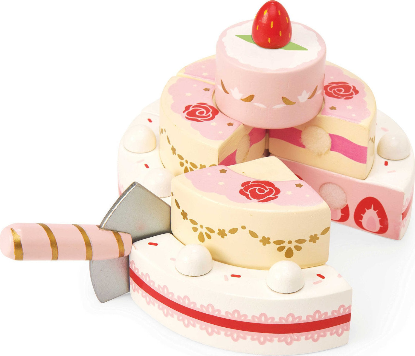 Ξύλινη τούρτα φράουλα που σε προδιαθέτει κάθε μέρα να γιορτάζεις, να μοιράζεις τα κομμάτια σε όσους φίλους μικρούς και μεγάλους θέλεις, ή να τα απολαμβάνεις μόνος σου! Έξι ξύλινα κομμάτια λαχταριστής τούρτας με γεύση φράουλα, με μία φράουλα για διακόσμηση στο κέντρο και μία σπάτουλα για το κόψιμο και το μοίρασμά της.