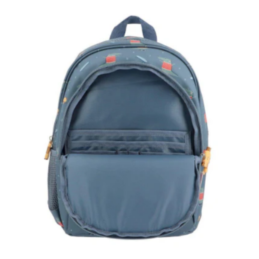 Η κύρια θήκη κλείνει με διπλό φερμουάρ και περιέχει ανοιχτή εσωτερική τσέπη. Εξωτερικά διαθέτει ενισχυμένη δικτυωτή πλαϊνή τσέπη για μπουκάλι νερού και μπροστινή τσέπη με φερμουάρ διάστασης 29x23cm.