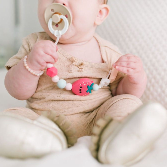 Το τέλειο κλιπ για να μην χάνεται ποτέ την πιπίλα σας! Και για να γίνει πιο "ενδιαφέρον", διαθέτει και μασητικό παιχνιδάκι ανάμεσα στις χαντρούλες για να ανακουφίζει τα ούλα των μωρών!