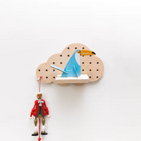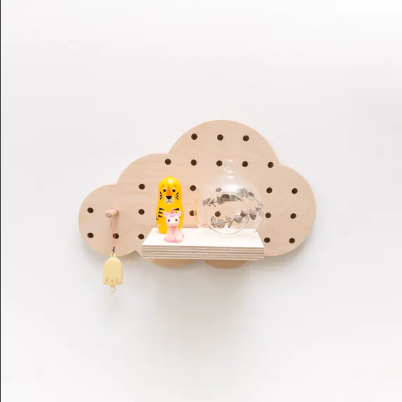 1 πάνελ σε σχήμα σύννεφου 30x19cm, 3 ξύλινους πείρους 5cm, 2 ξύλινους πείρους 9cm, 1 ραφάκι 13x9cm, 1 άγκιστρο για στήριξη στον τοίχο
