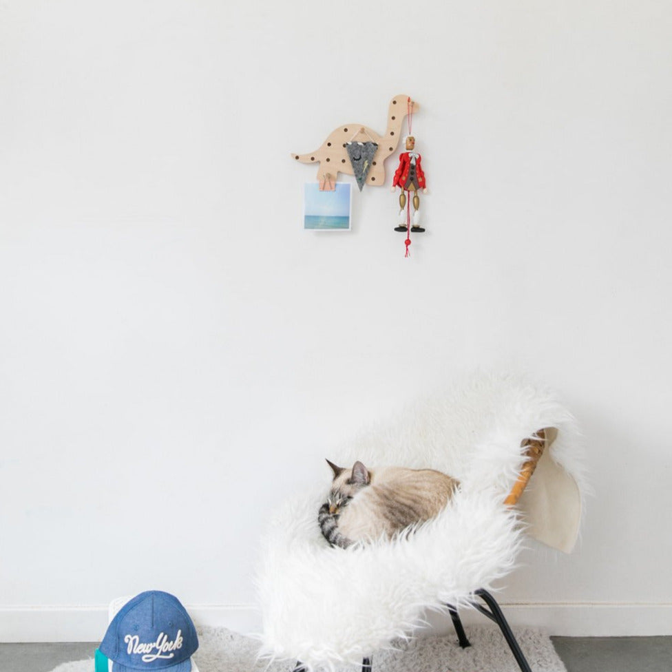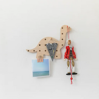 1 πάνελ σε σχήμα δεινόσαυρου 29x19cm, 5 ξύλινους πείρους 5cm, 1 άγκιστρο για στήριξη στον τοίχο