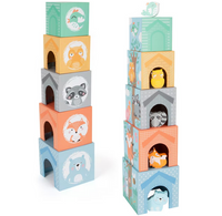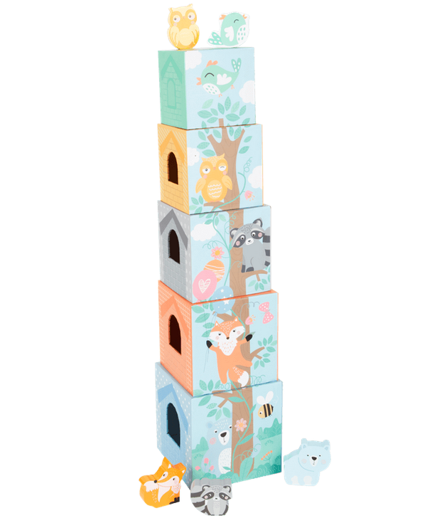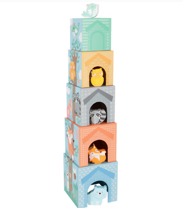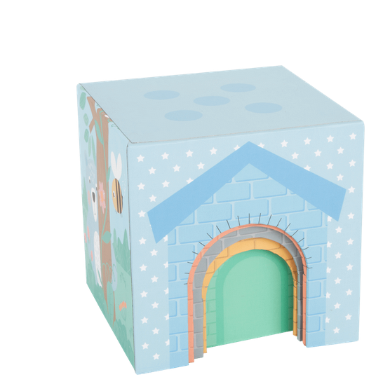 Σετ με 5 κύβους και 5 ξύλινα ασορτί ζωάκια που μένουν στον κάθε έναν από αυτούς! Τα τέσσερα κυβάκια έχουν πορτούλα και παραθυράκια για να κρύβονται τα ζωάκια, ενώ τα εικαστικά σχέδια βοηθούν τα παιδιά στο πως θα πρέπει να τα τοποθετήσουν το ένα πάνω στο άλλο! Όταν τελειώσει το παιχνίδι, οι κύβοι στοιβάζονται ο ένας μέσα τον άλλο.
