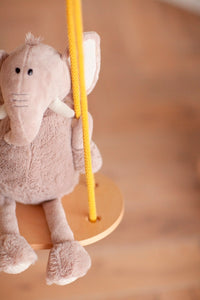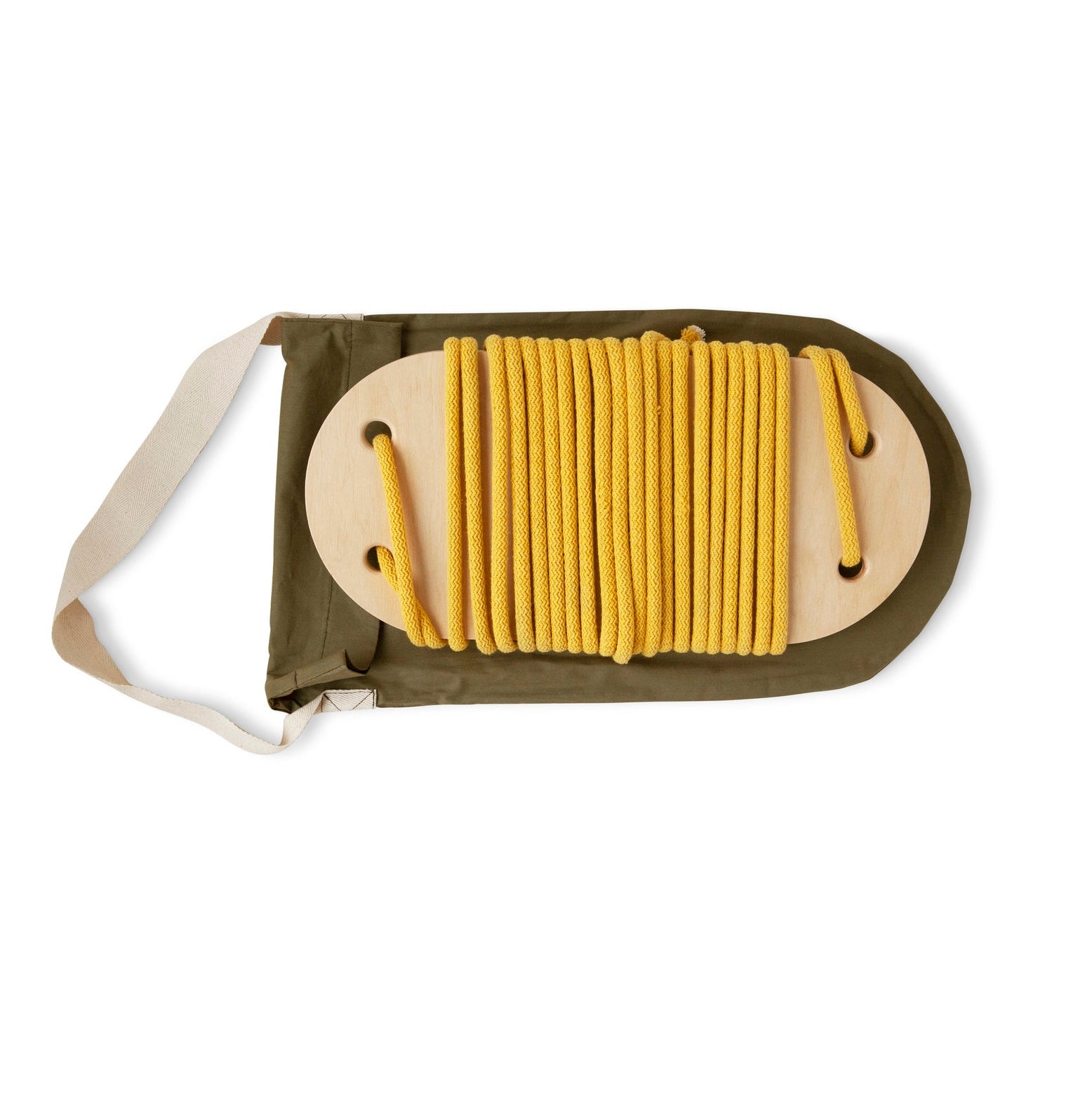 Περιλαμβάνει: Ξύλινη χειροποίητη κούνια σε φυσικό χρώμα με κίτρινο σχοινί, 2 μεταλλικά κλιπ και υφασμάτινη τσάντα μεταφοράς.