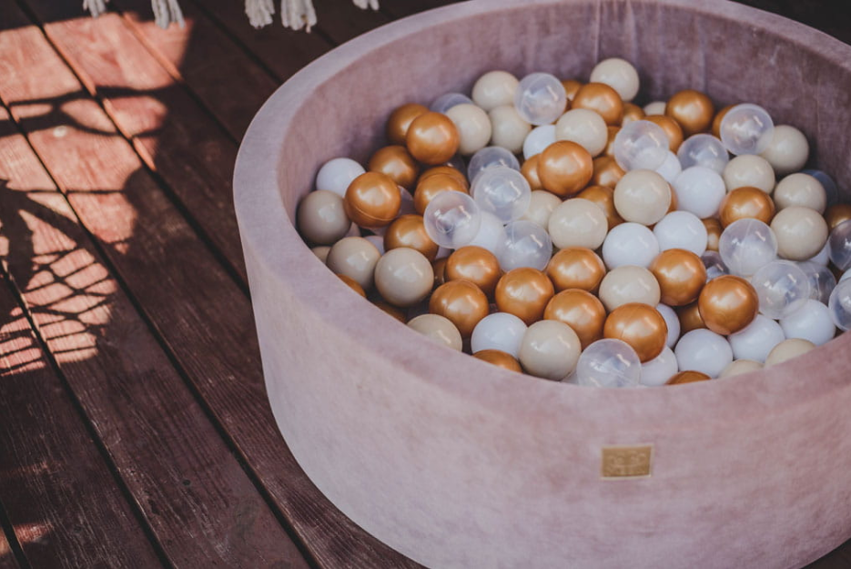 Περιλαμβάνει 250 πλαστικά μπαλάκια σε συνδυασμό χρωμάτων: λευκό, μπεζ, χρυσό, διαφανές.